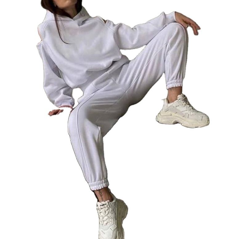 Chándales sólidos personalizados para mujer, conjuntos de dos piezas, Top corto con hombros descubiertos, Sudadera con capucha y traje de pantalón 2026
