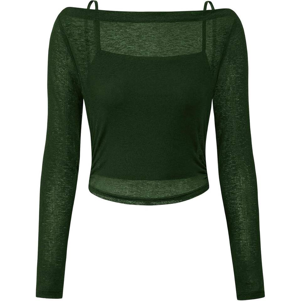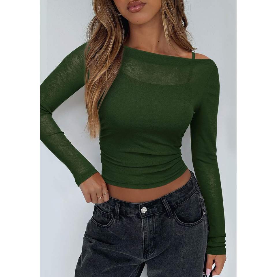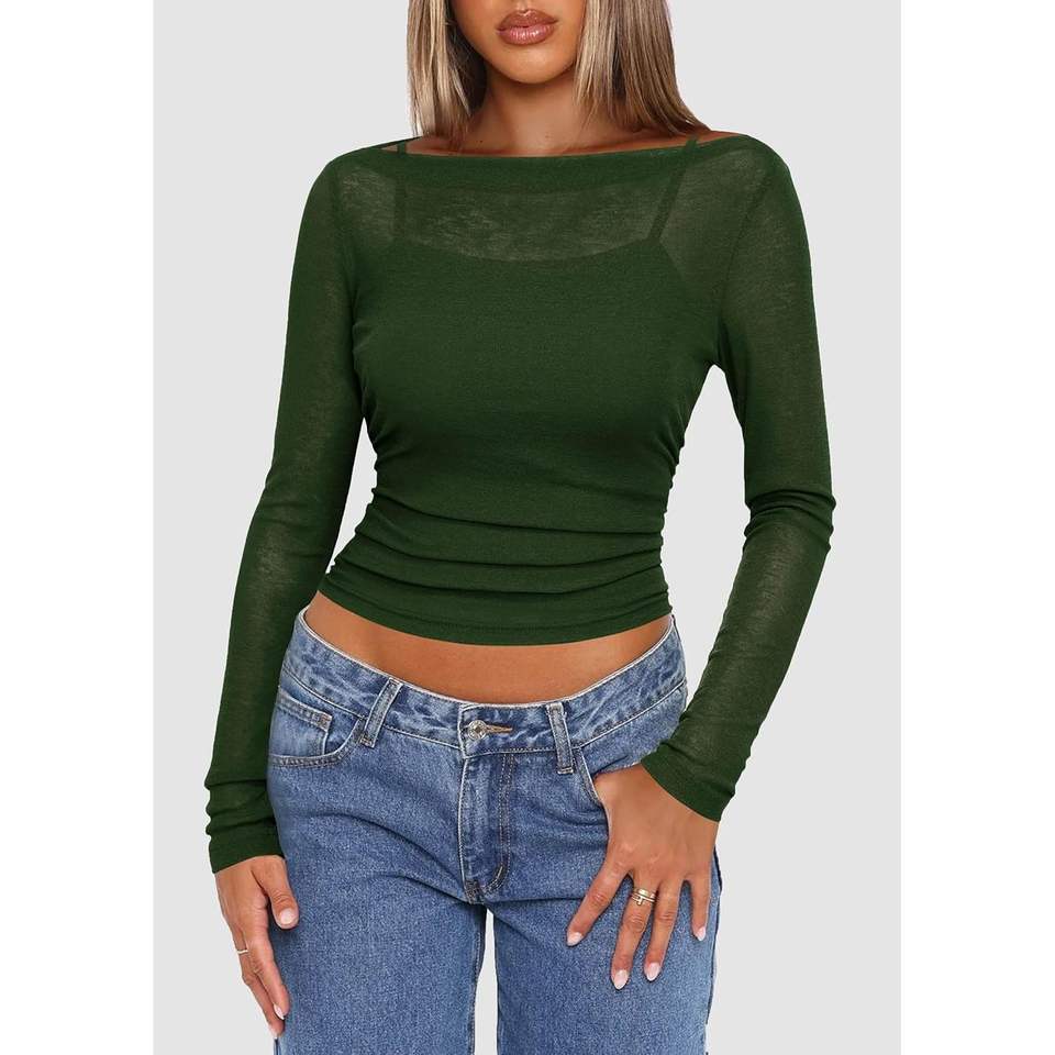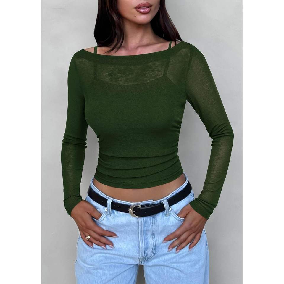 Conjunto de 2 Piezas Personalizado para Mujer, Blusas de Manga Larga, Tops Cortos Transparentes con Cuello Barco, Camisola con Tirantes Finos para Club