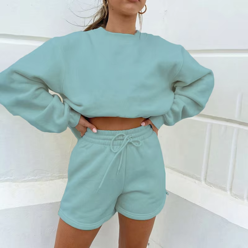 Conjunto de Sudadera de Forro Polar con Cuello Alto Holgado y Pantalones Cortos de Punto por Encima de la Rodilla para Mujer, Estilo Informal de Invierno, 2 Piezas