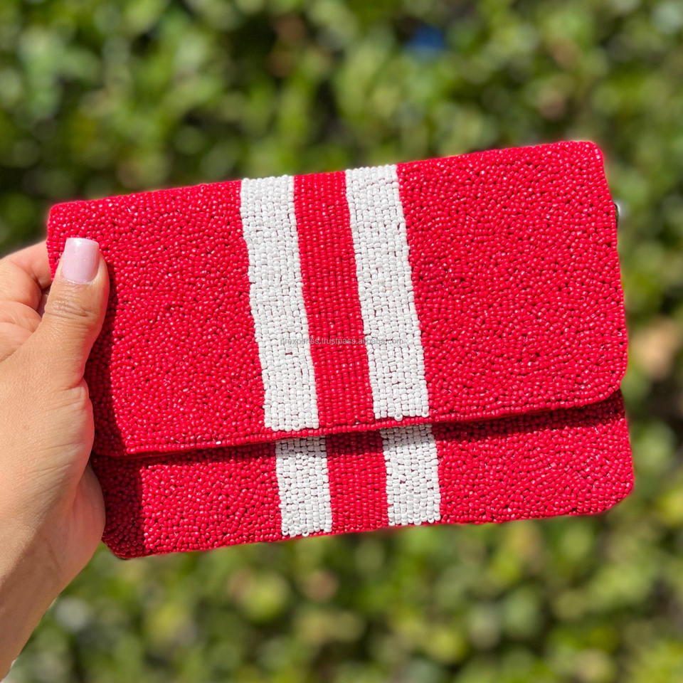 Bolso de mano personalizado con cuentas de semillas rojas para mujer, hecho a mano bolso cruzado, monedero de moda duradero con bordado de rayas blancas