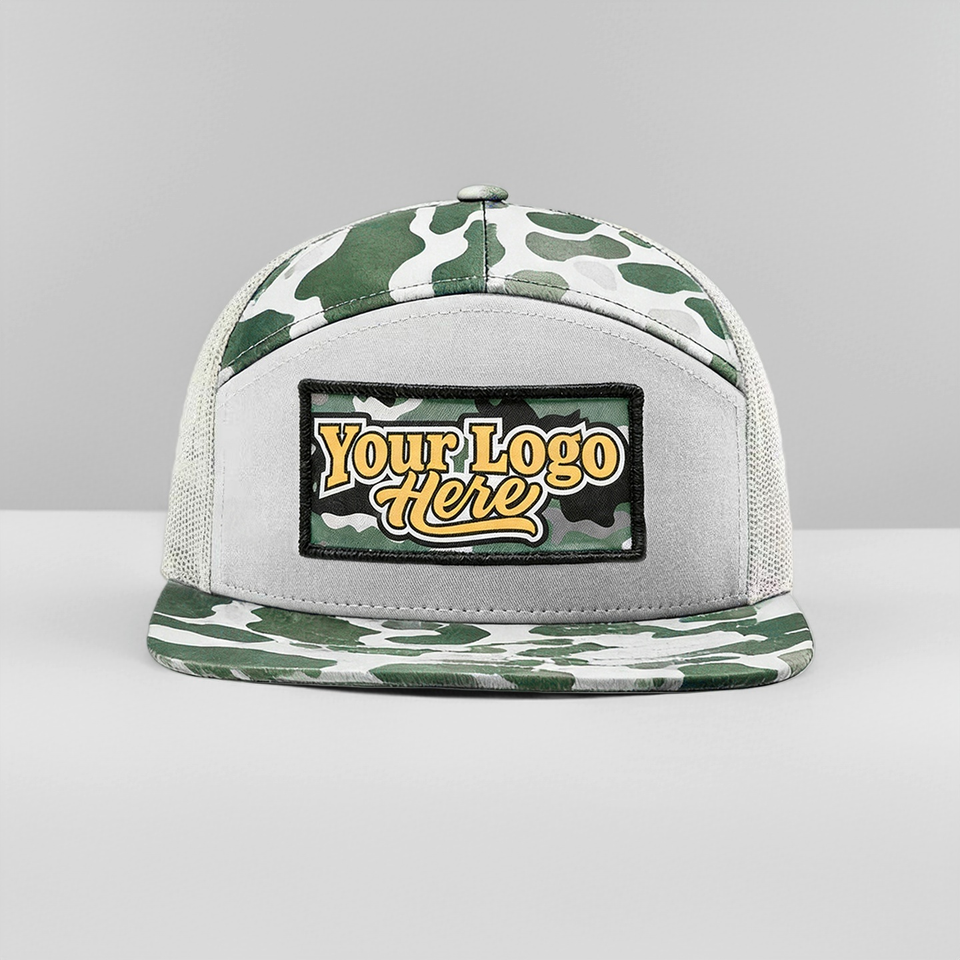 Gorra de béisbol de camuflaje de 7 paneles de alta calidad con parche de logotipo bordado 2D 3D y etiqueta tejida personalizada, gorra trucker de malla a la moda con cierre snapback 168