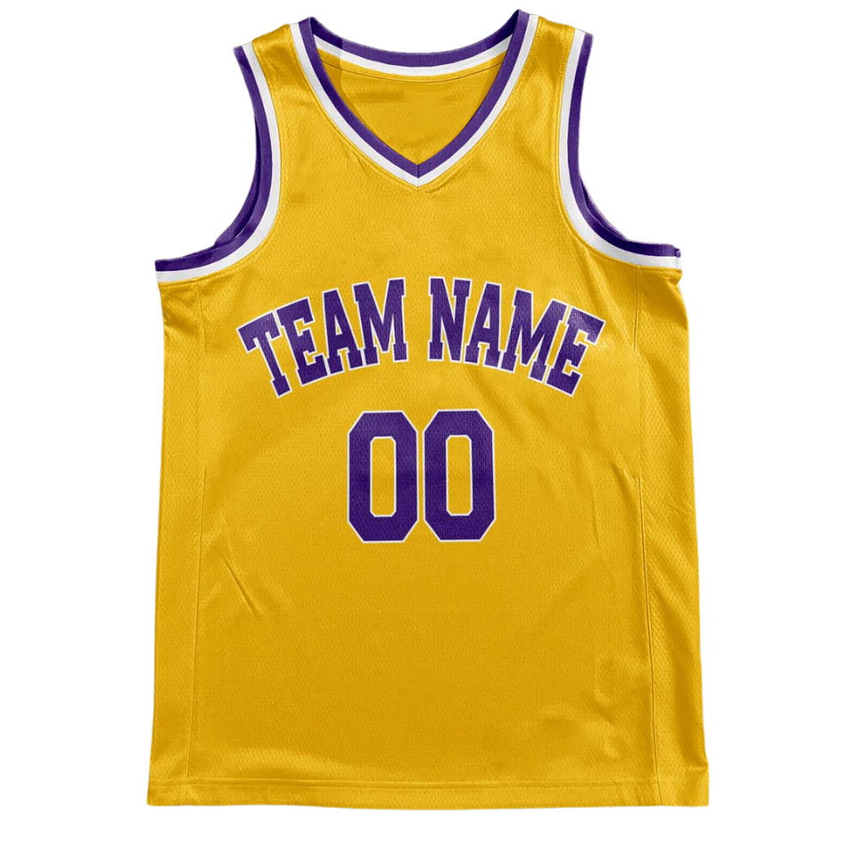 Conjunto de Uniforme de Baloncesto Retro Personalizado en Amarillo, Jersey con Cuello Blanco y Morado, Pantalones Cortos, Nombre y Número del Equipo, Estilo Clásico