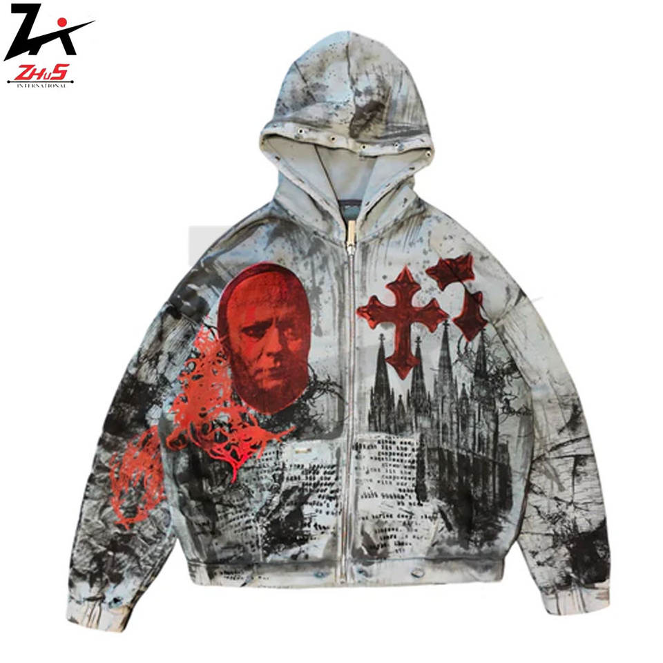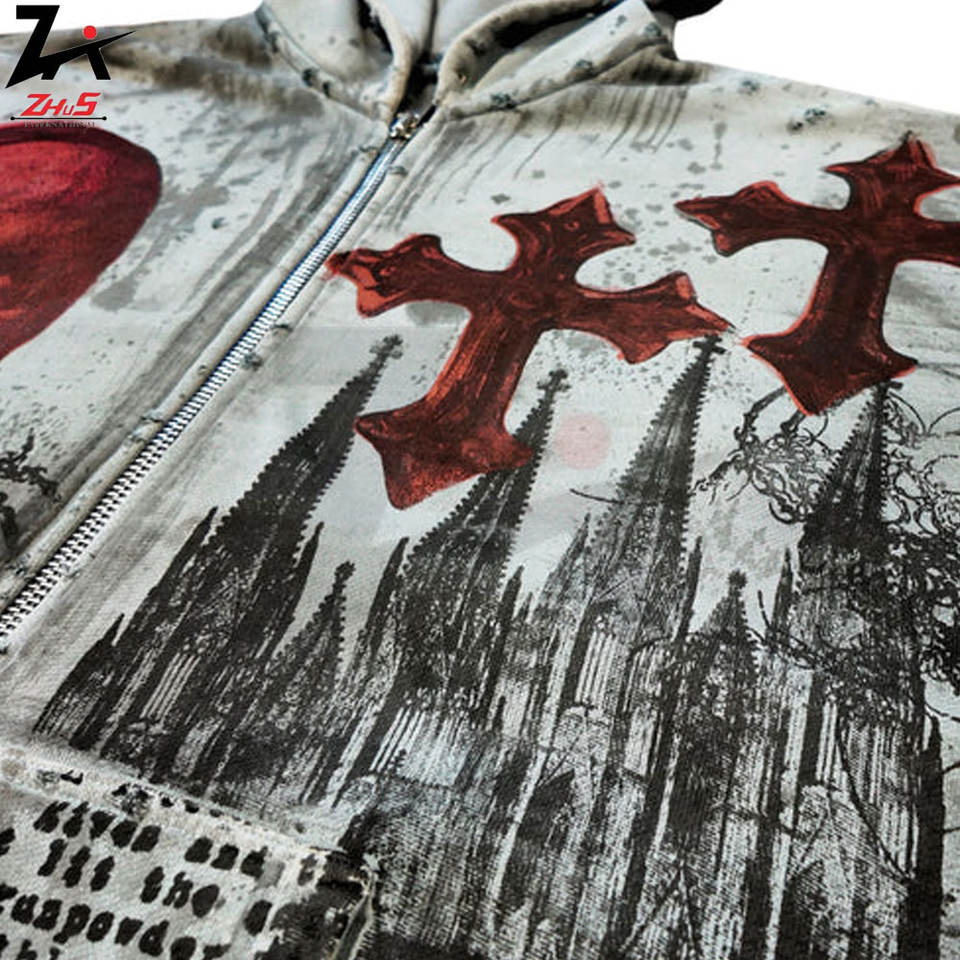 Sudadera con capucha y cremallera personalizada Detalles desgastados Metal teñido a mano 100% algodón pesado Sudadera con capucha con cremallera personalizada Fabricación a medida