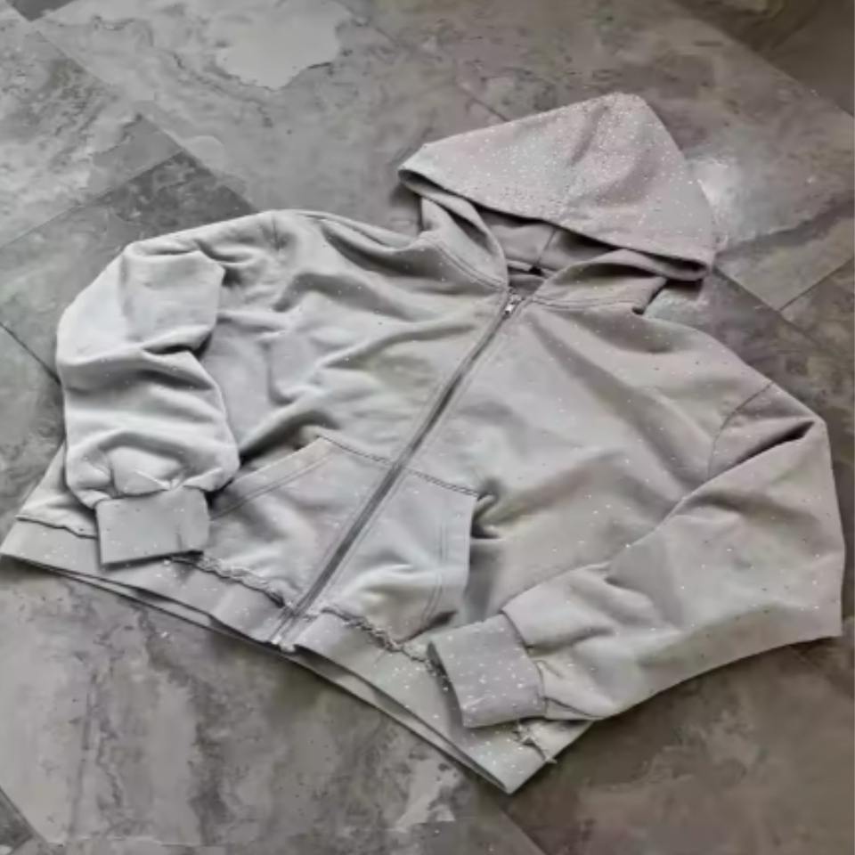 Sudadera con capucha vintage para hombre, personalizada, con cremallera, pedrería brillante, de algodón grueso, felpa francesa, lavado ácido