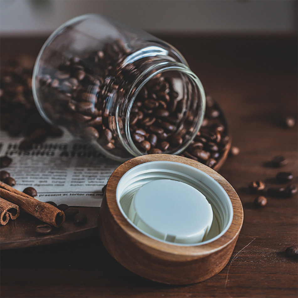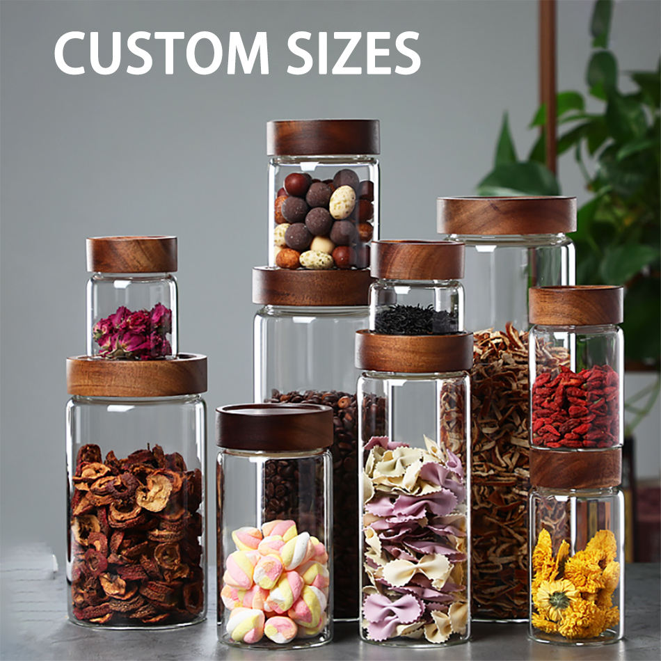 Tarro de almacenamiento de especias de vidrio de grado alimenticio para cocina con forma de cilindro transparente personalizado alto borosilicato hermético Acacia té café azúcar sal