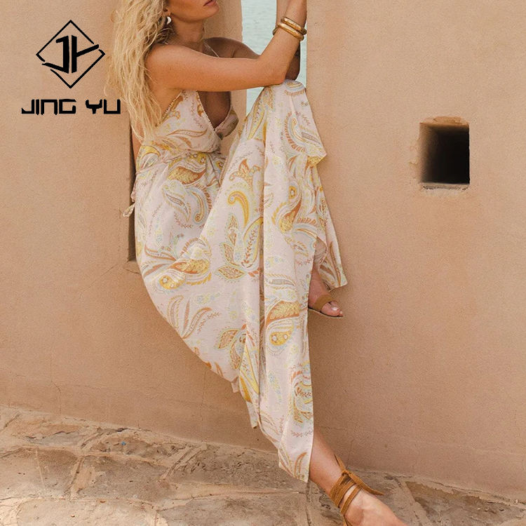 Vestido fluido con cuello en V, estilo bohemio, estampado personalizado, de rayón transpirable de alta calidad, sin espalda.