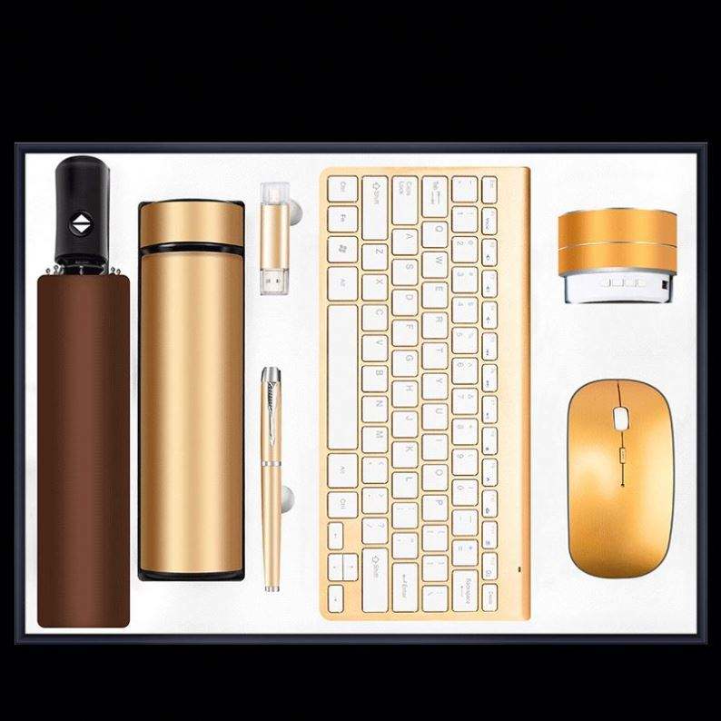 Set de Regalo Personalizado con Logotipo: Teclado Inalámbrico 7 en 1, Mouse, Memoria USB, Altavoz Bluetooth, Bolígrafo, Taza y Paraguas para Motivar a los Empleados