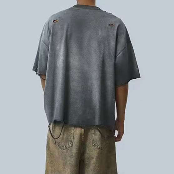 Camiseta de algodón 100% con logotipo personalizado, lavado ácido, diseño con anillo metálico, efecto desgastado y rotos, cuello holgado para hombre