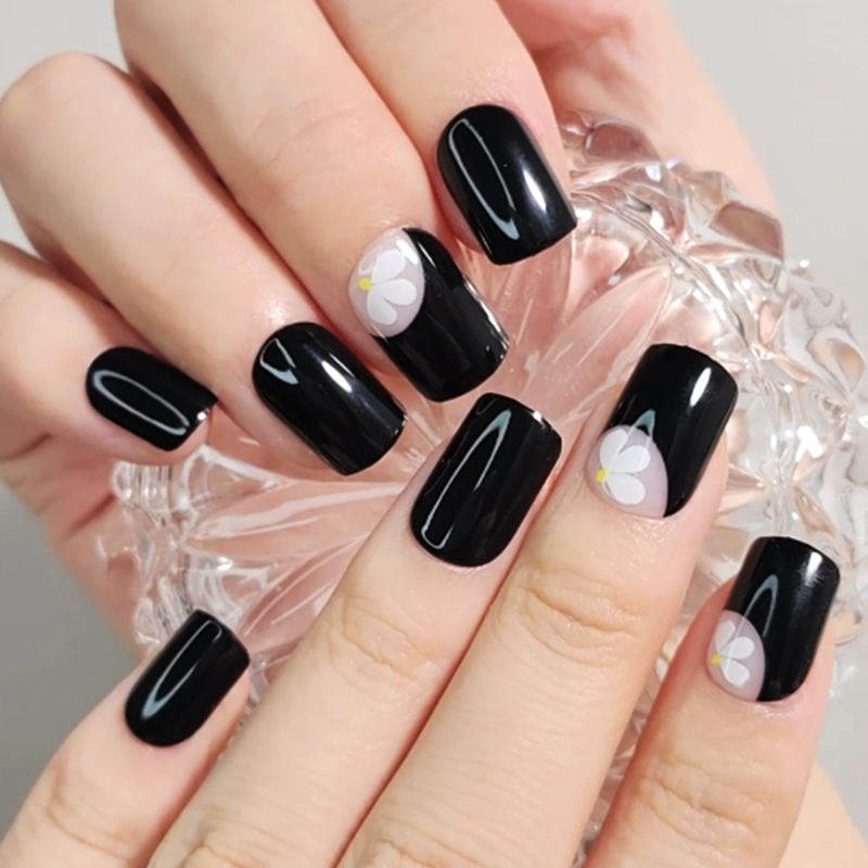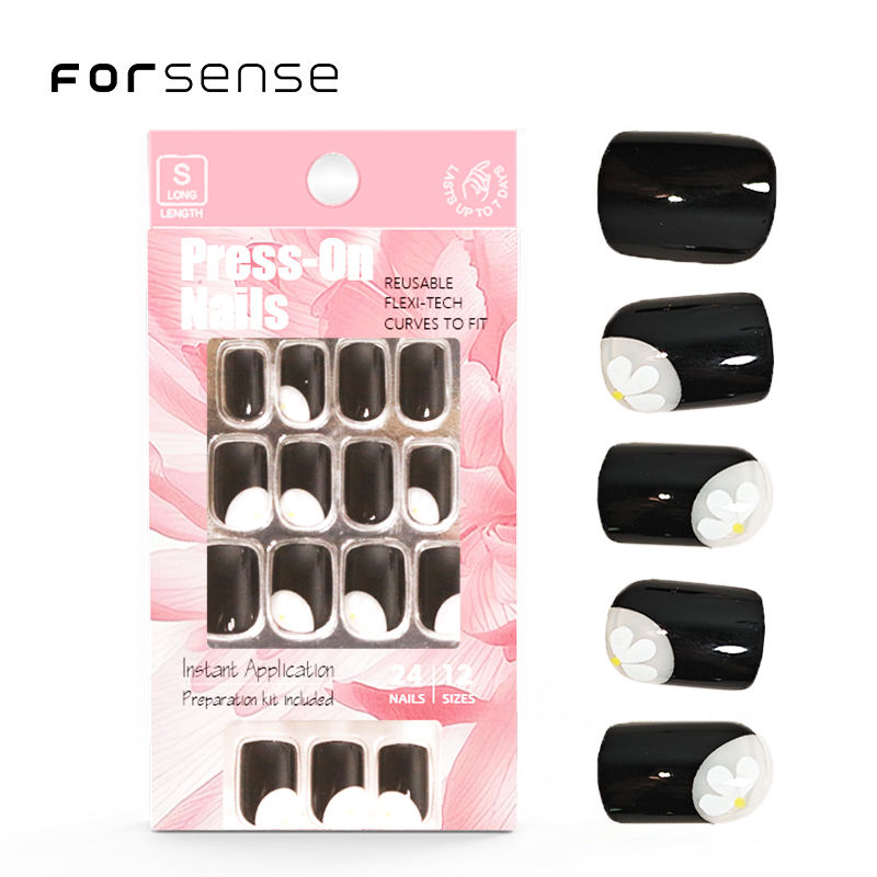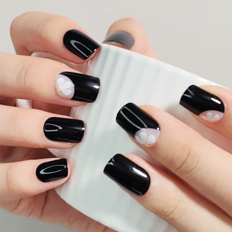 Kit de uñas cuadrado corto con logotipo personalizado con pegamento y lima de uñas caja de embalaje puntas de uñas postizas negras diseño de flores Faux ongles