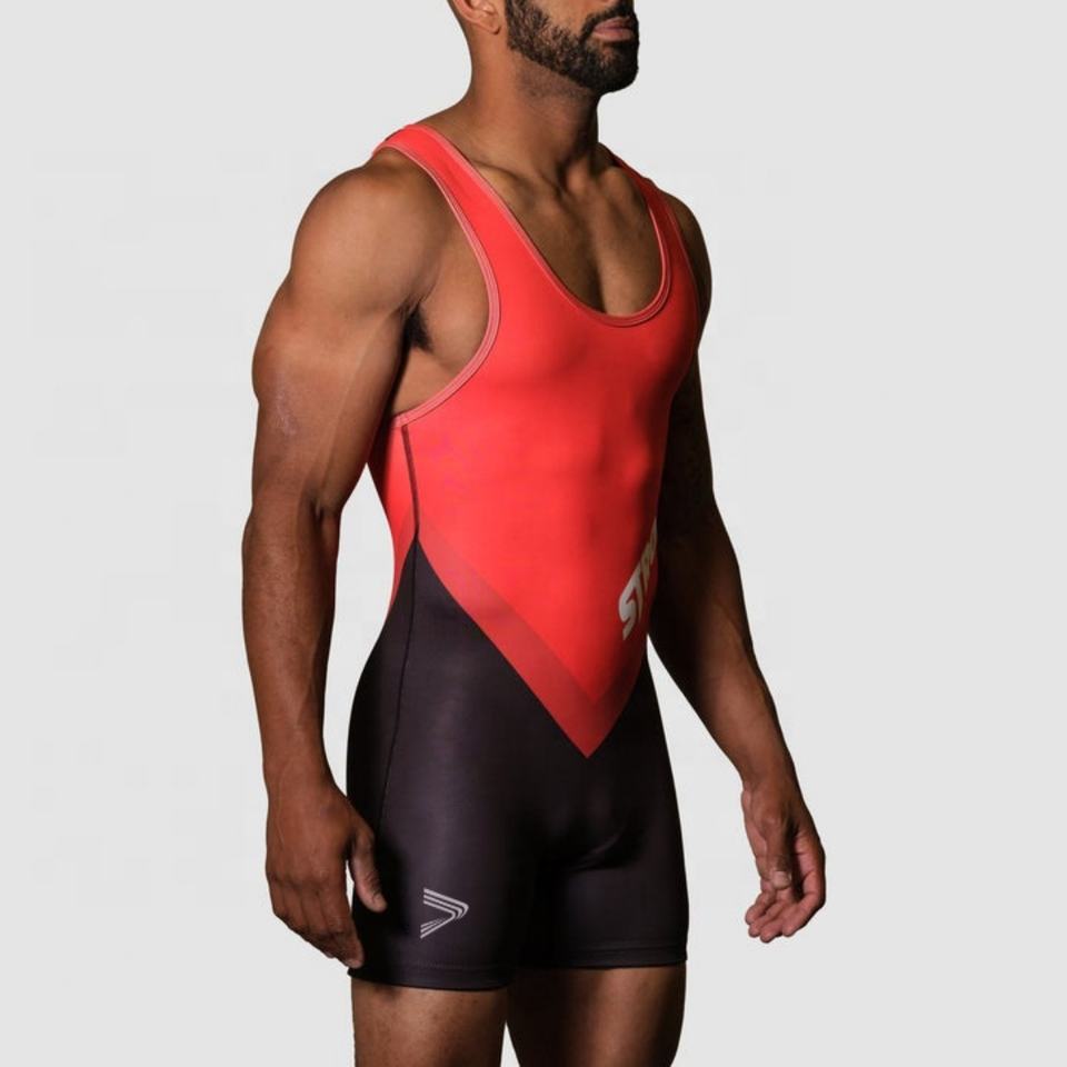 Conjunto de Uniforme de Halterofilia Sublimado con Logotipo Personalizado, Color Morado y Rojo, Singlet para Levantamiento de Pesas