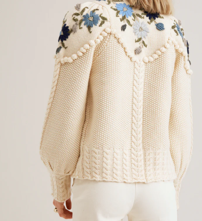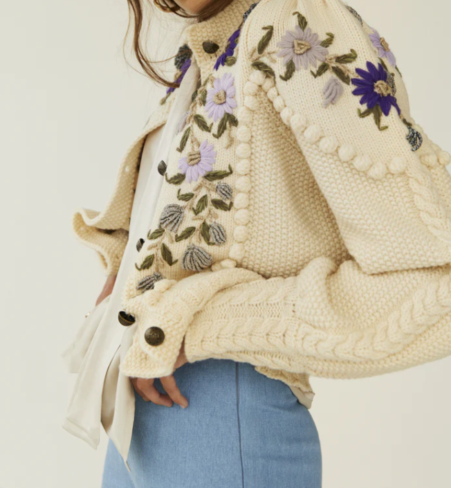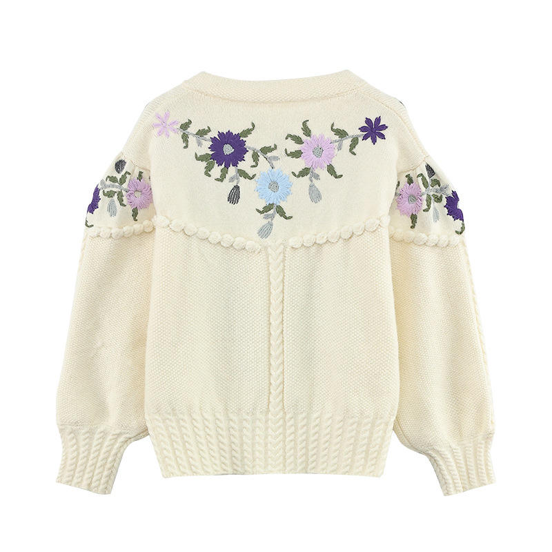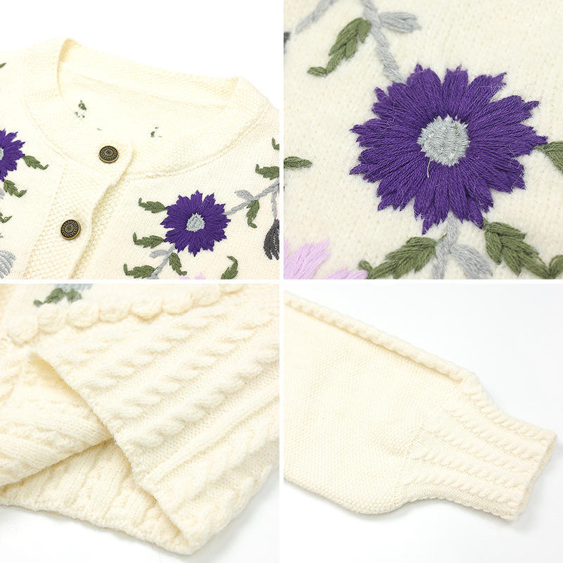 Suéter con logotipo personalizado para mujer, cárdigan corto elegante de ganchillo de manga larga, cárdigans de punto con bordado de flores para mujer