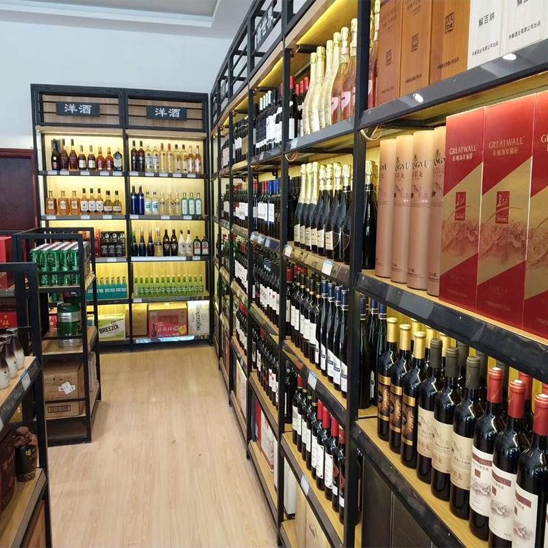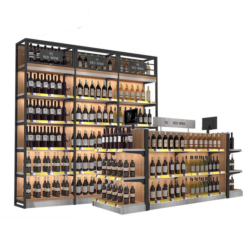 Hecho a medida de acero y estructura de madera estantes se utilizan para vino de la pantalla o la colocación de productos en el supermercado bar tiendas