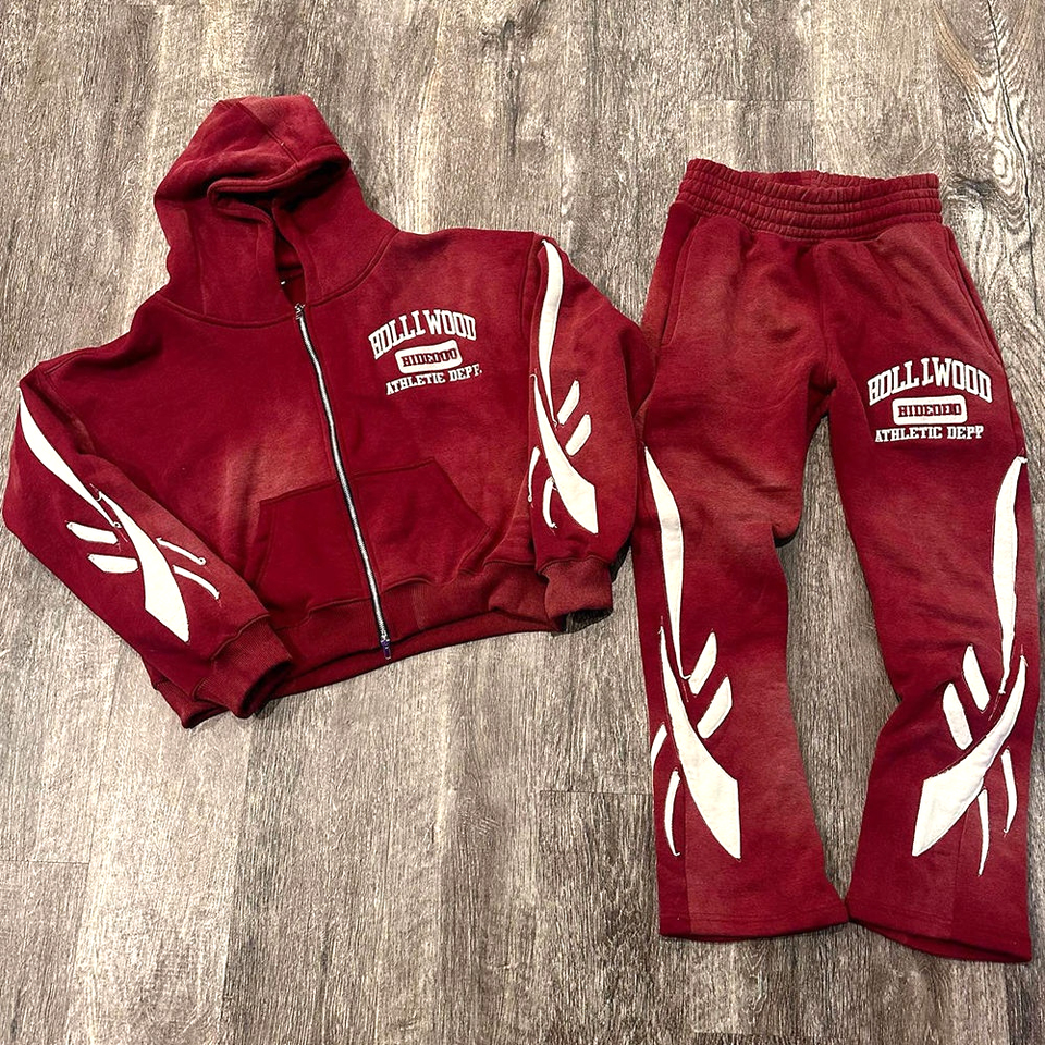 Conjunto de sudadera con capucha personalizada, conjunto de sudadera con apliques bordados y efecto desgastado, conjunto de sudadera con efecto descolorido por el sol y lavado ácido
