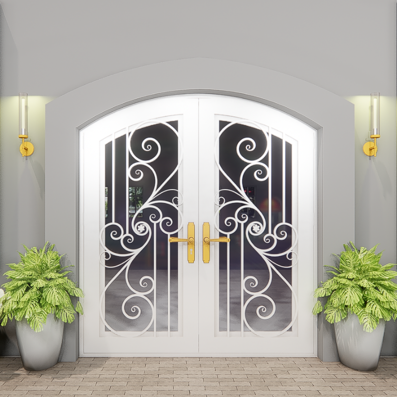 Puerta de metal de tamaño personalizado con patrones de hierro artístico y vidrio doble de alta calidad para proyectos residenciales