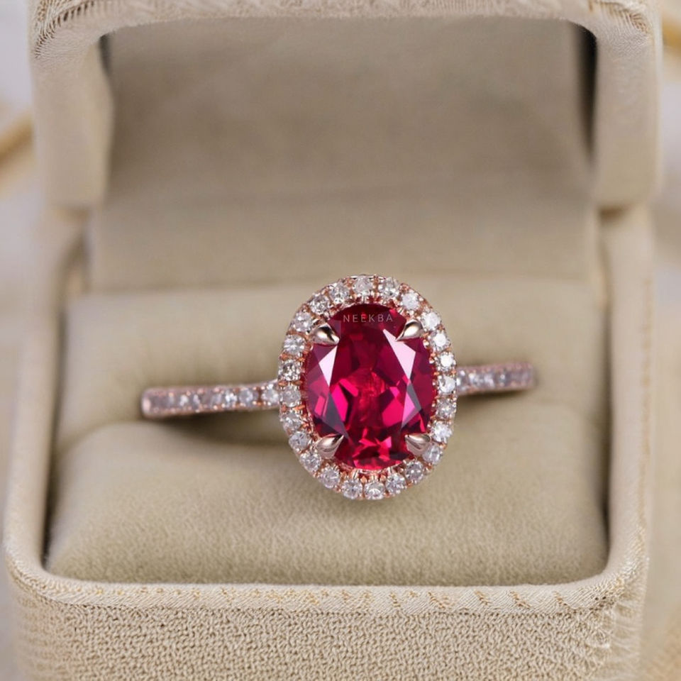 Personalizable estilo Art Deco 14K anillo de oro sólido 6*8mm forma ovalada Lab-Grown Ruby Halo anillo apilable disponible varios tonos de metal