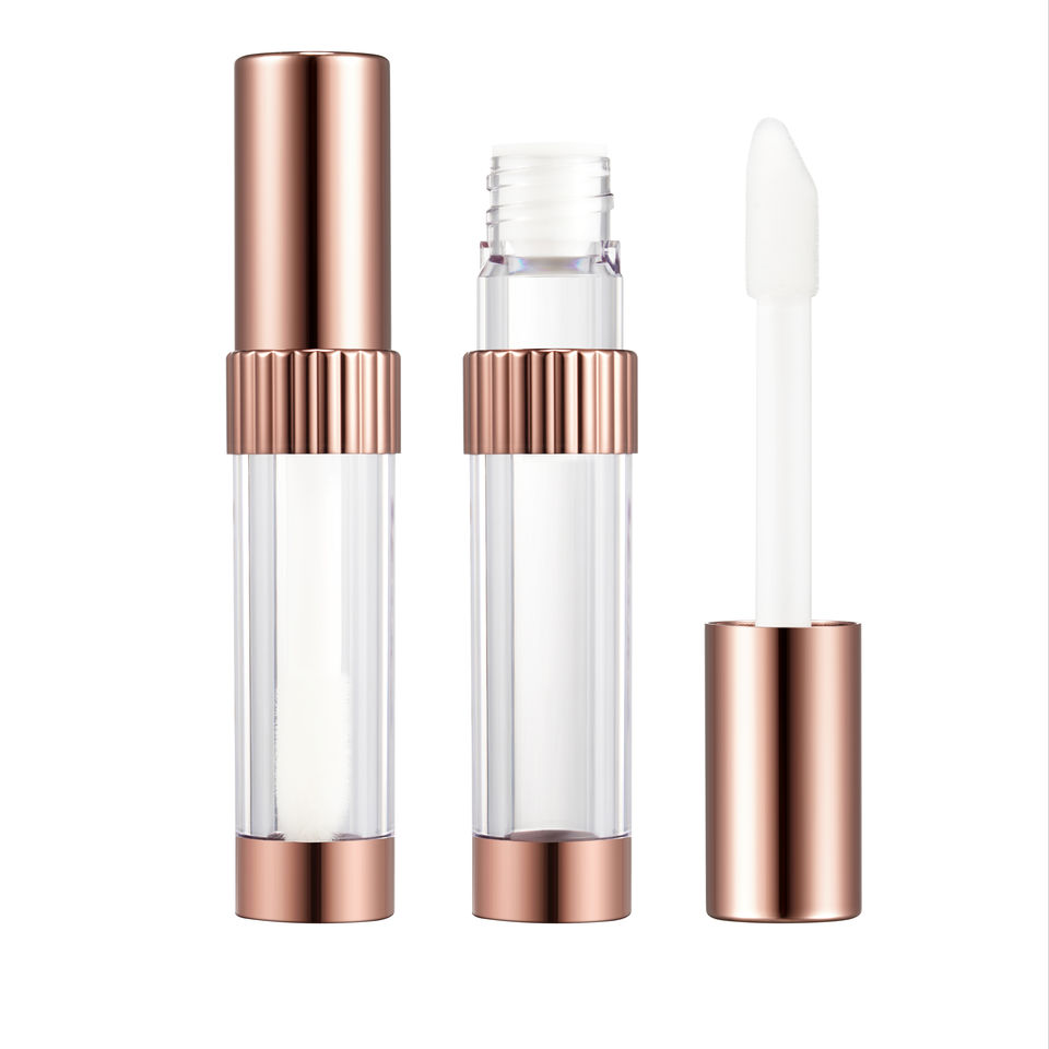 Envase cosmético personalizable Tubos de brillo de labios cilíndricos cristalinos con detalles estriados de oro rosa