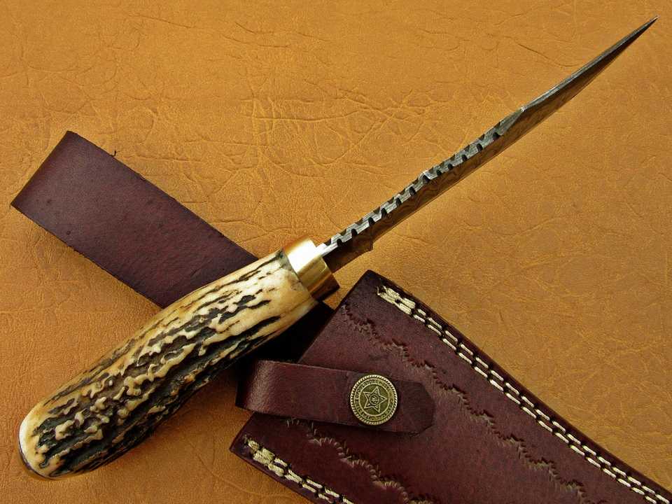 Cuchillo de caza de Damasco personalizable hecho a mano con cuerno de ciervo, mango de refuerzo de latón, funda de transporte de cuero, nuevo producto OEM de lanzamiento