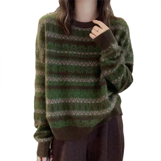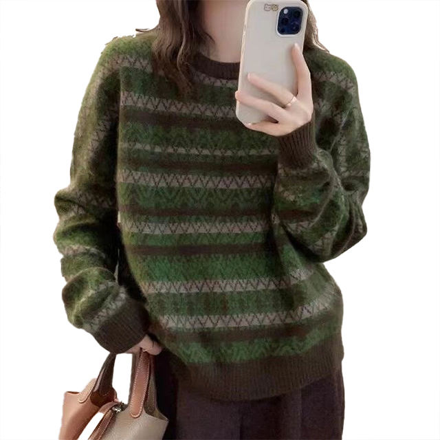 Suéter de Punto Personalizable, Casual, Moderno, Rejuvenecedor, Otoño Invierno, Cuello Redondo, Diseño Retro a Rayas, para Mujer