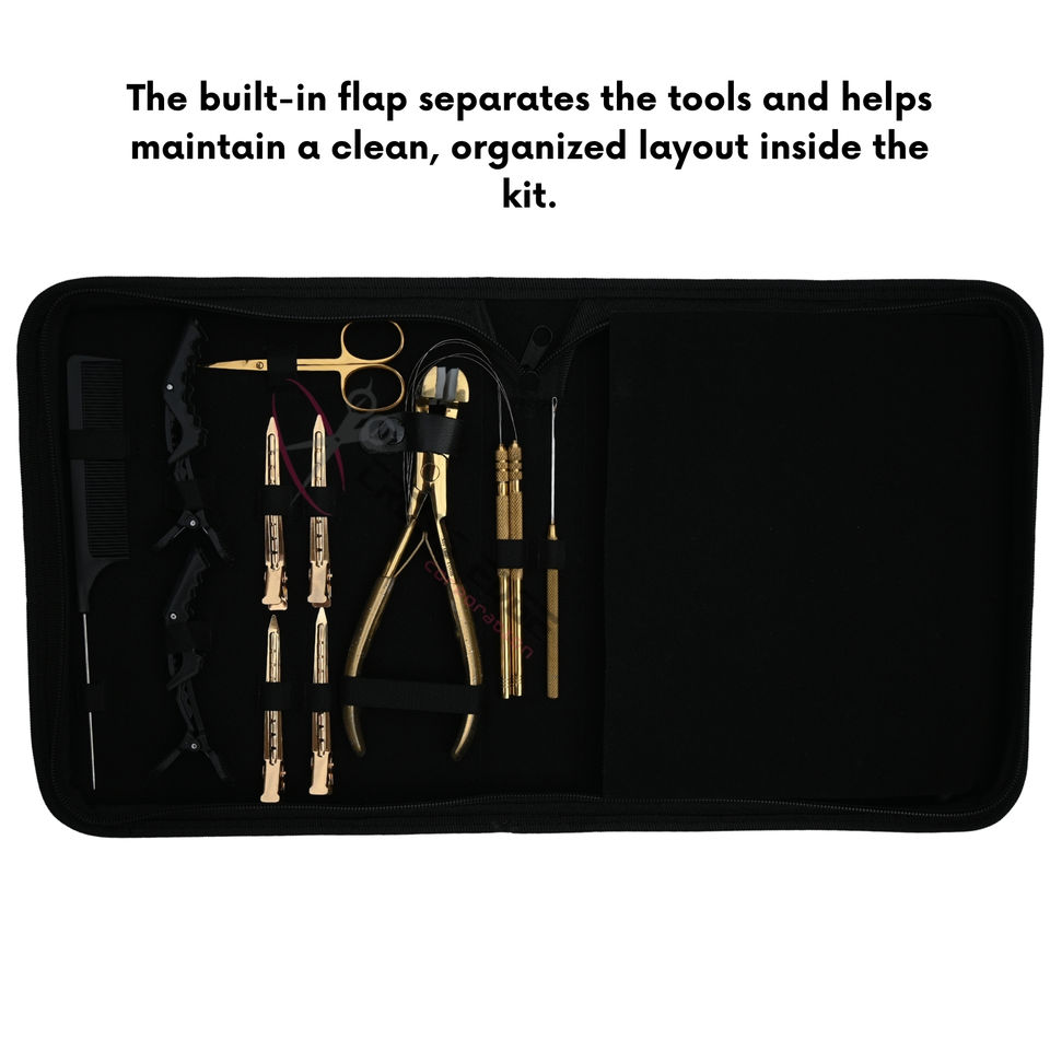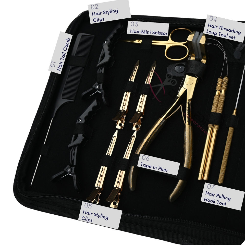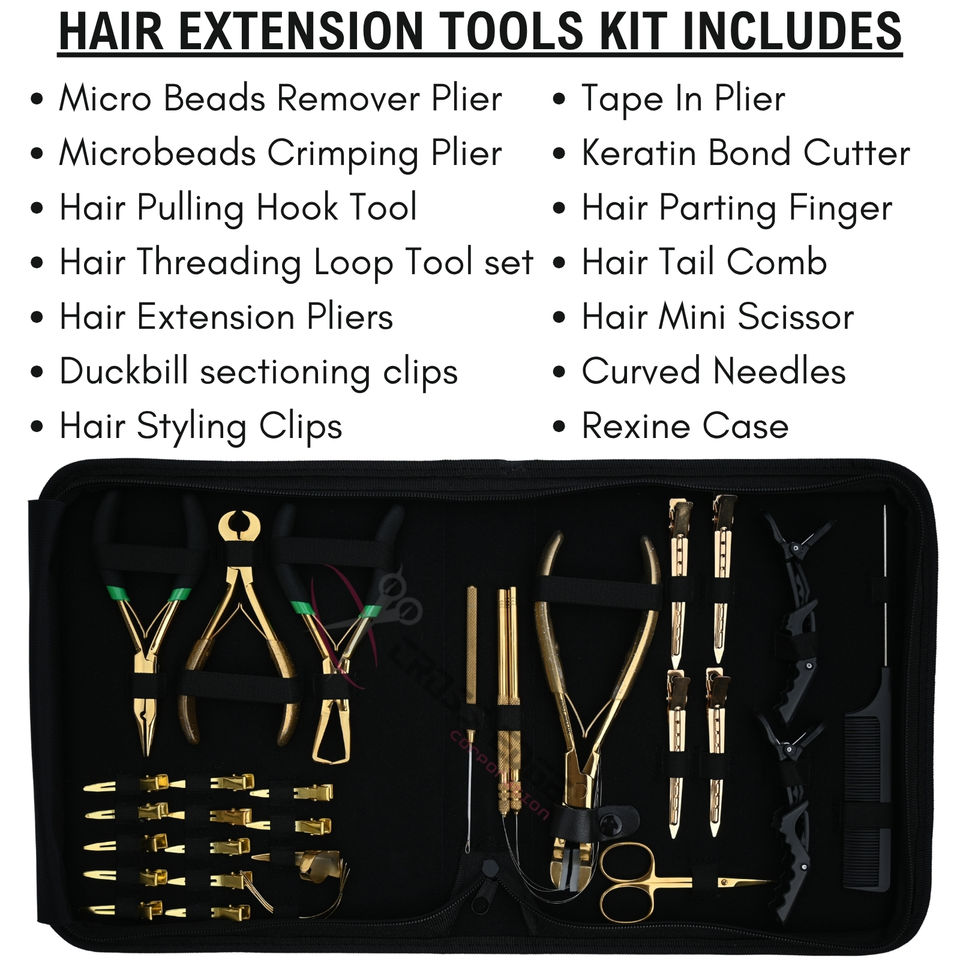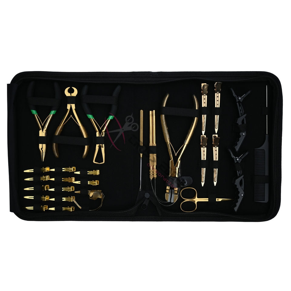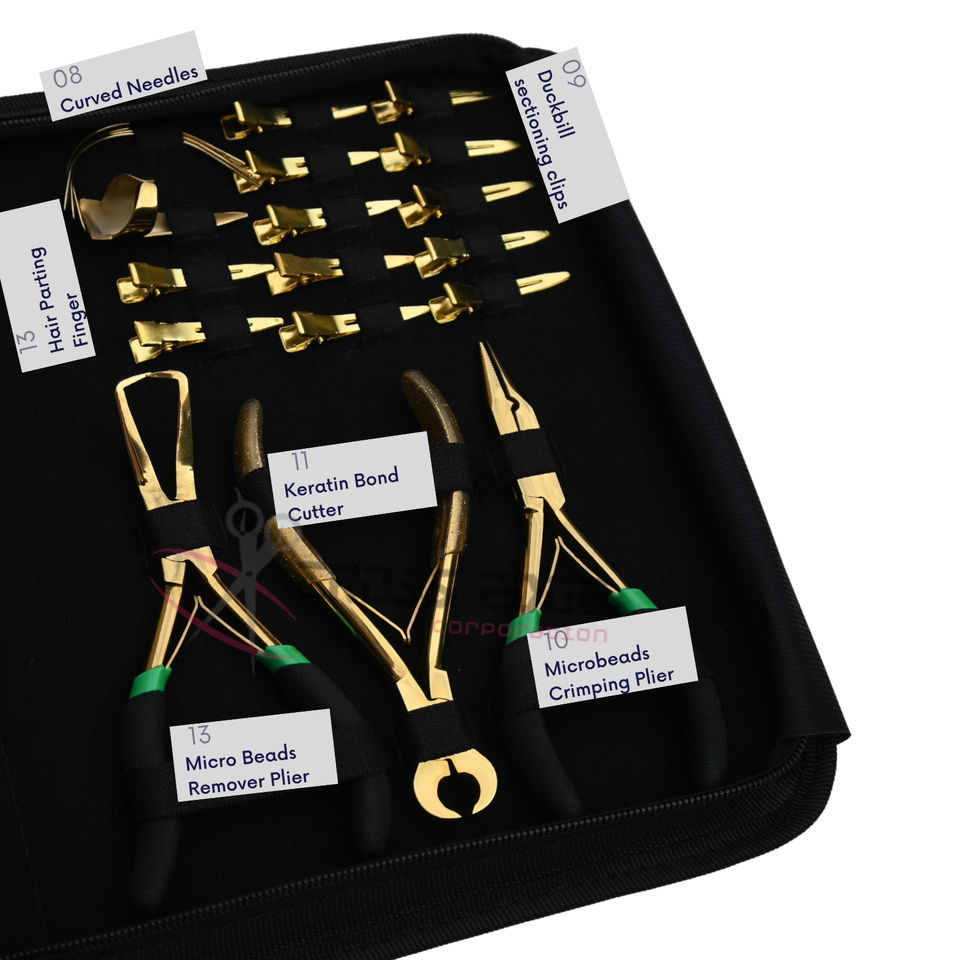 Juego de accesorios personalizables para extensiones de cabello doradas: Pinza para cinta adhesiva dorada, removedor de microperlas, herramienta de crimpado, cortador de enlaces de gancho y bucle, clips.