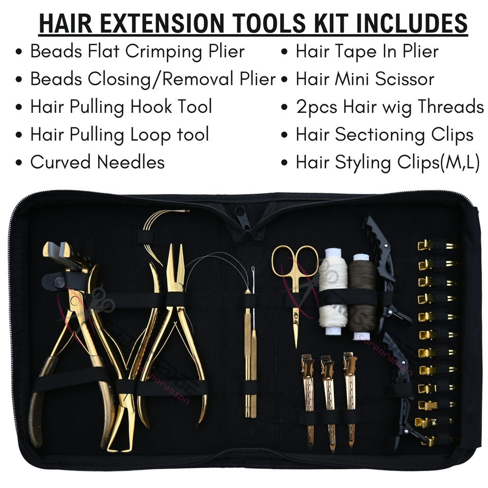 Juego de accesorios personalizables de herramientas de extensión de cabello dorado