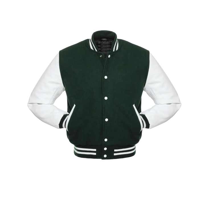 Chaqueta Varsity de Invierno Personalizable con Cuello Alto, Cuerpo Verde y Mangas de Cuero Blanco para Hombres Adultos