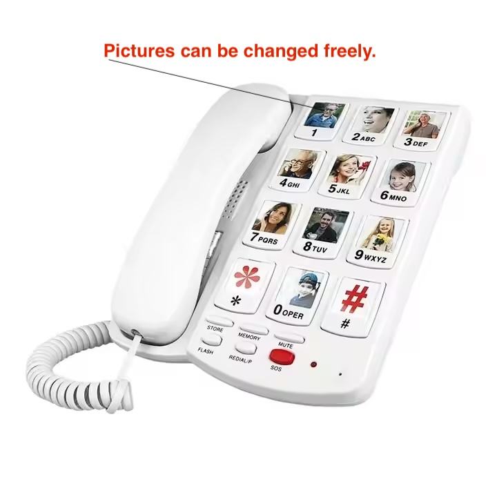 Característica:Botón grande + altavoz + amplificador + Redial + marcador de foto programable