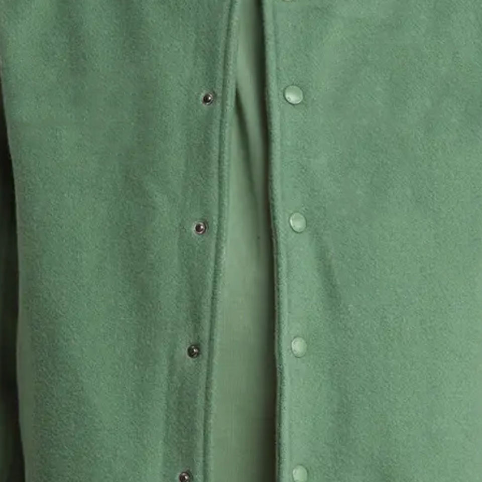 Chaqueta Varsity de Invierno Personalizable en Verde Claro, 100% Lana, Estilo Urbano con Cuello Alto, Logotipo Universitario Premium, Tela de Lona