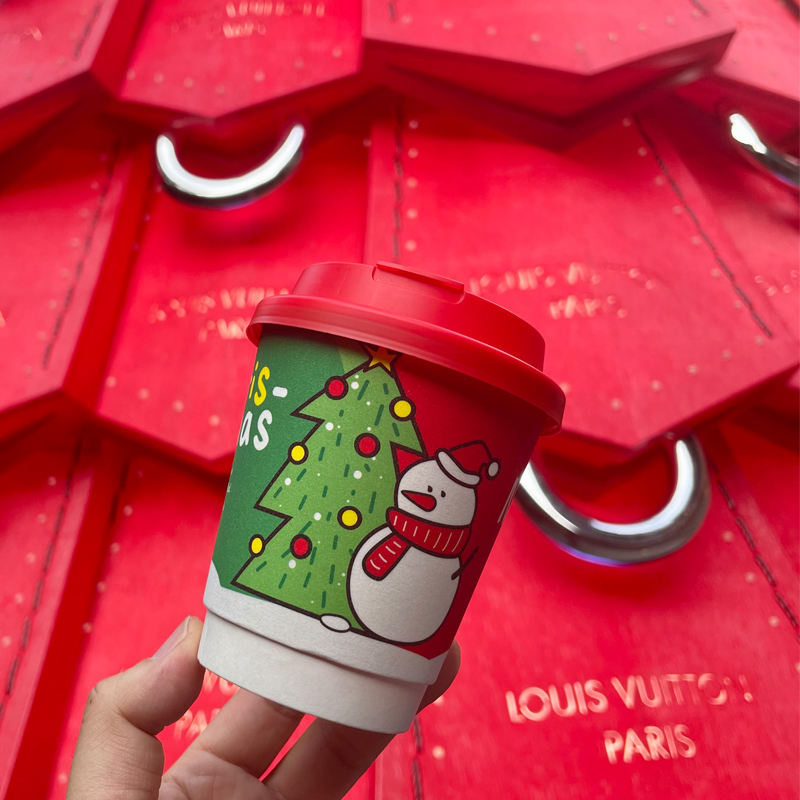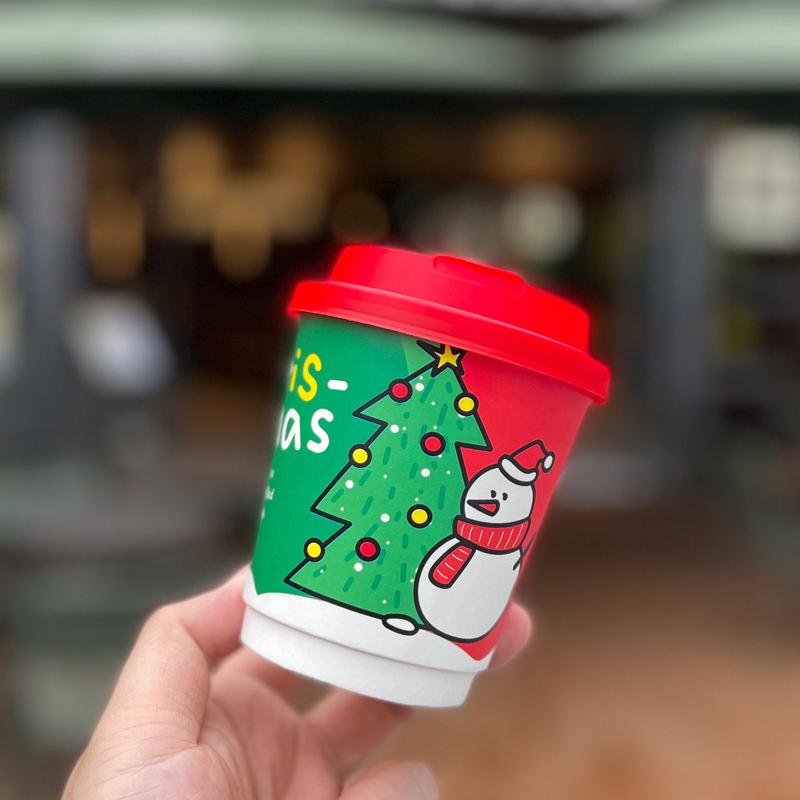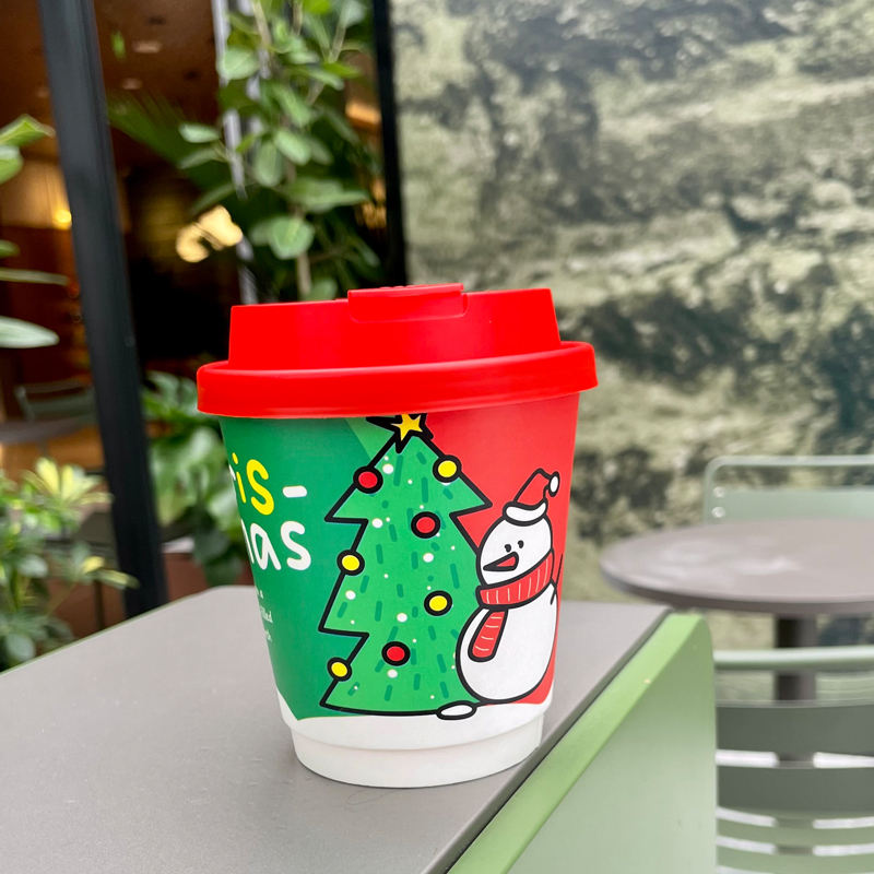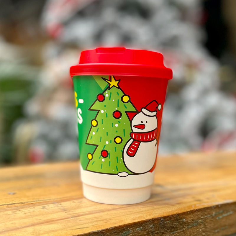 Vaso de Papel Desechable Personalizable con Logotipo para Té con Leche Rojo de Doble Pared con Tapa para Bebidas Calientes, Vaso de Papel Navideño con Logotipo