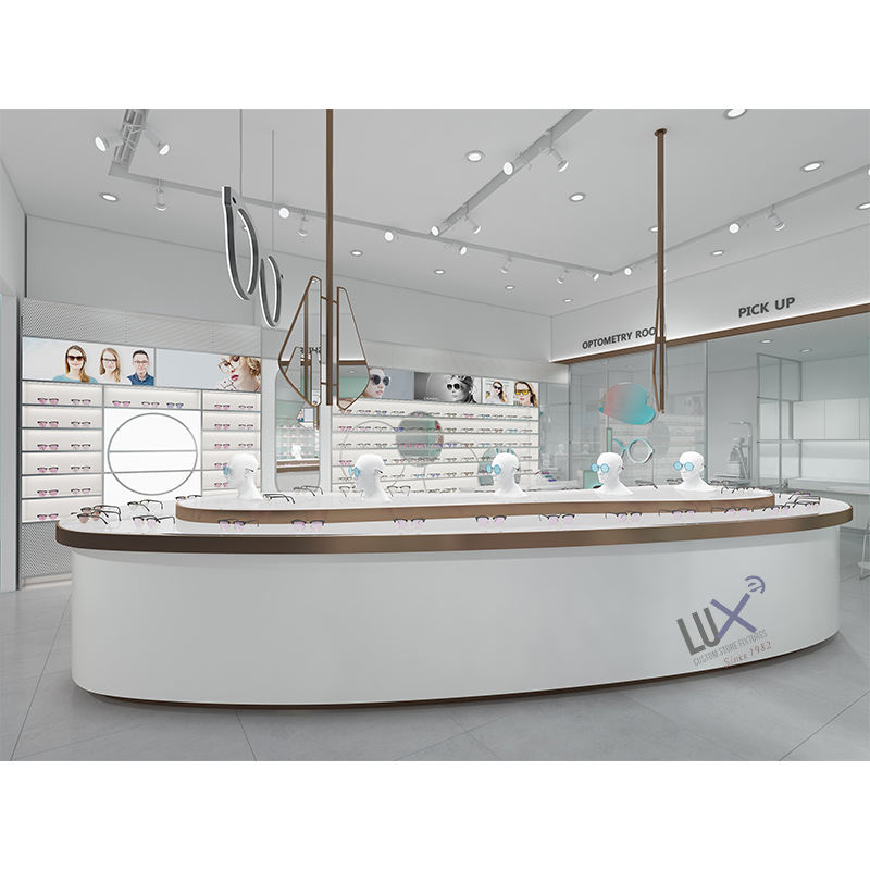 Soporte de exhibición de pared de madera respetuoso con el medio ambiente impermeable marca LUX logotipo personalizable para gafas iluminación LED diseño de mostrador de tienda minorista
