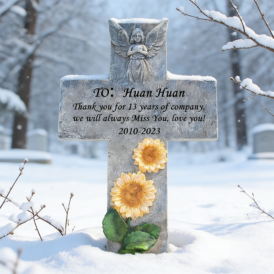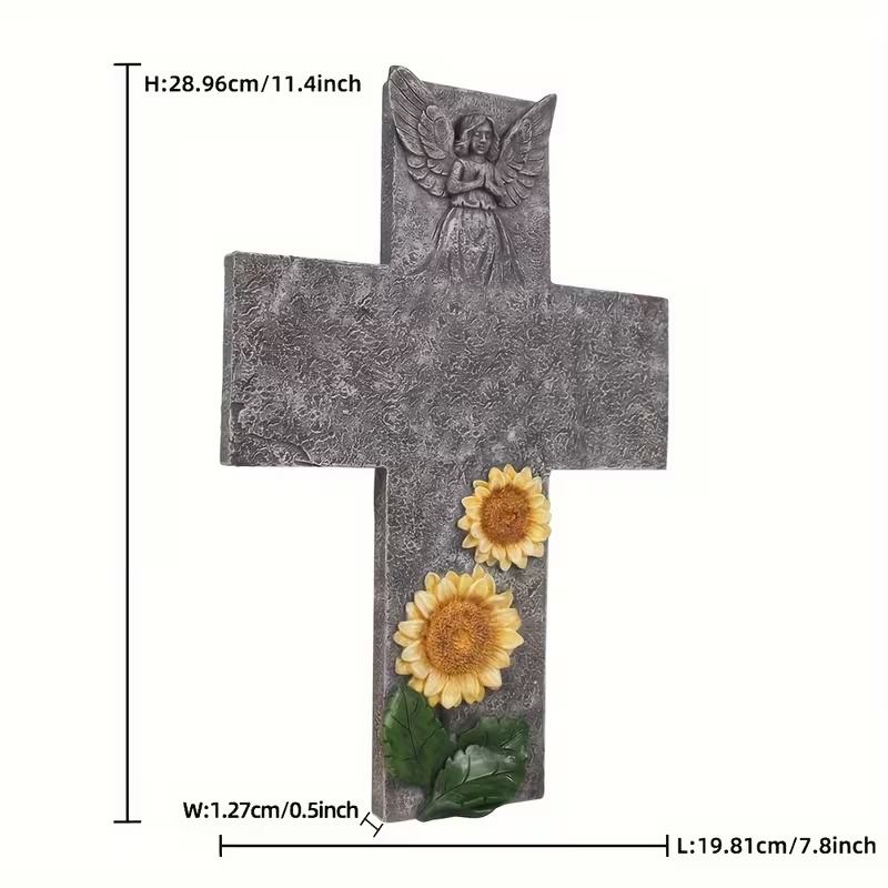 Placa Conmemorativa de Resina Personalizable con Cruz - Nombre/Fecha/Cita Grabable, Diseño de Ángel y Girasol, Ideal para Decoración de Jardín