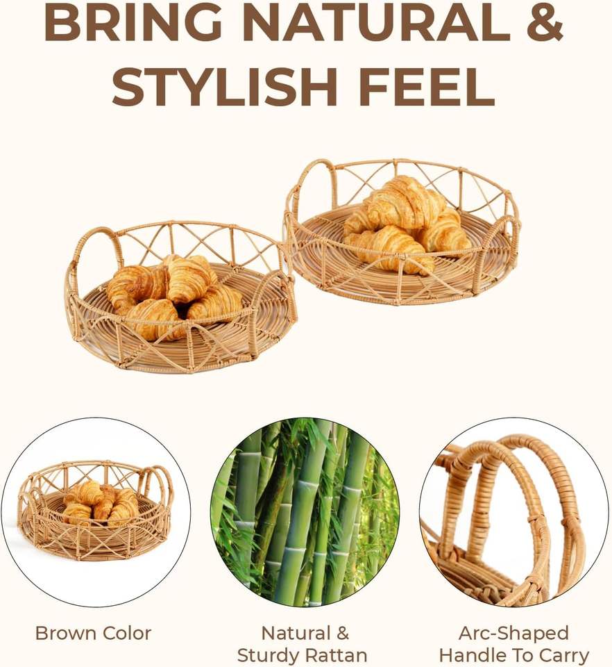 Juego personalizable de 2 bandejas redondas de ratán con asas bandejas decorativas para servir alimentos y bebidas cestas de almacenamiento tejidas