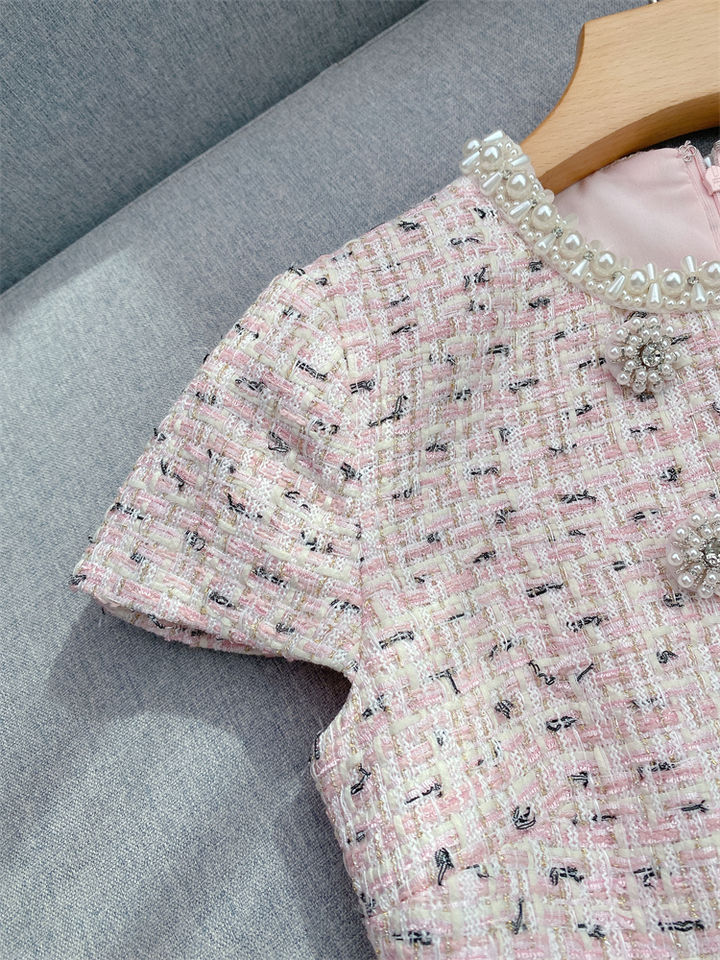 Vestido Midi Vintage Francés Personalizado, Vestido Sin Mangas con Botones de Tweed Rojo Rosado, Ropa de Mujer, Prenda Elegante con Cintura Natural