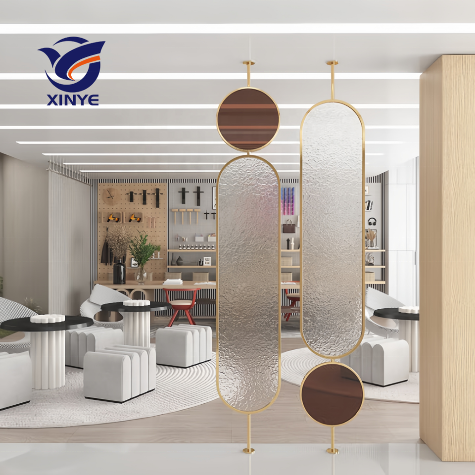 Divisor de Metal con marco de acero inoxidable ovalado dorado moderno personalizado con pantalla de cristal de espejo para partición de sala de estar de oficina
