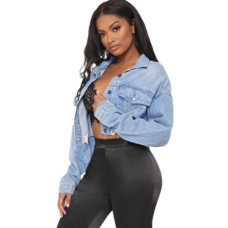 Chaqueta Vaquera Corta de Algodón 100% Personalizable, Chaqueta Informal Premium Desgastada para Mujer, Chaqueta Vaquera Elegante al por Mayor 2025