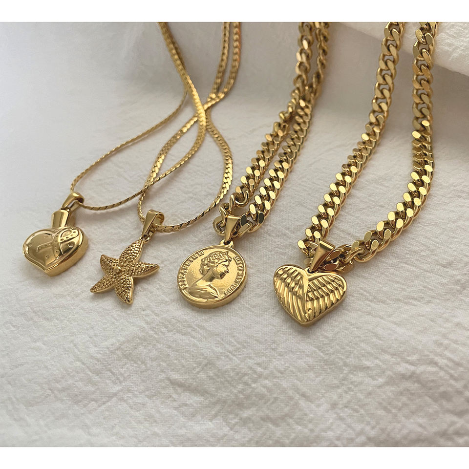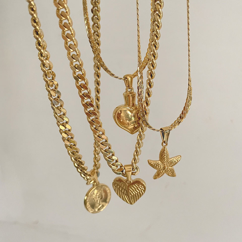 Collar cadena de eslabones cubanos con moneda personalizada, botella de Perfume de plumas, corazón de amor, estrella de mar, joyería minimalista de acero inoxidable