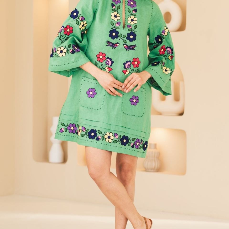 Vestido de Lino y Algodón Bordado Personalizado, Elegante, Cuello en V, Casual, Manga Corta, Midi, Vestido de Verano para Mujer