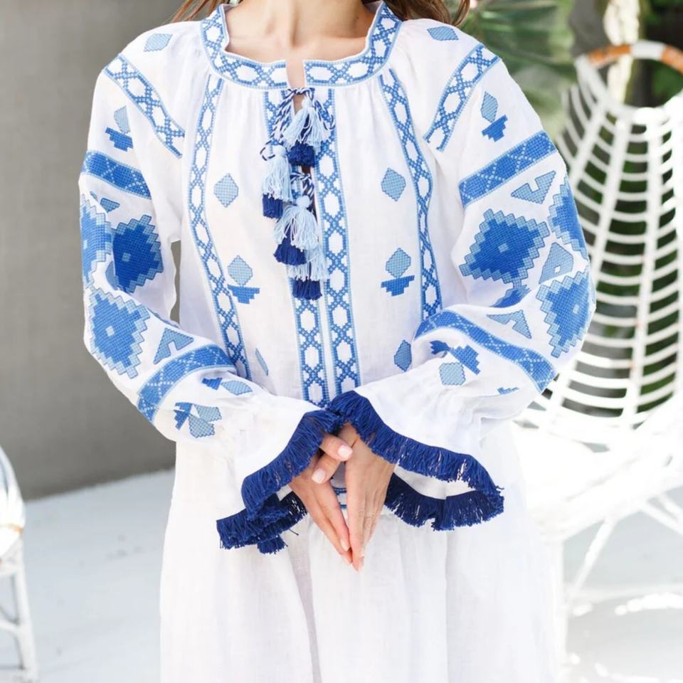 Vestido de Lino y Algodón Bordado Personalizado, Elegante, Cuello Redondo, Casual, Corte en A, Mangas Abullonadas, Midi, Vestido de Verano para Mujer