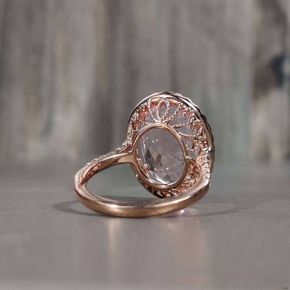 Personalizar oro corte ovalado Rosa morganita y Halo diamante anillo mujeres boda Compromiso 14K oro amarillo piedra de nacimiento anillo para ella
