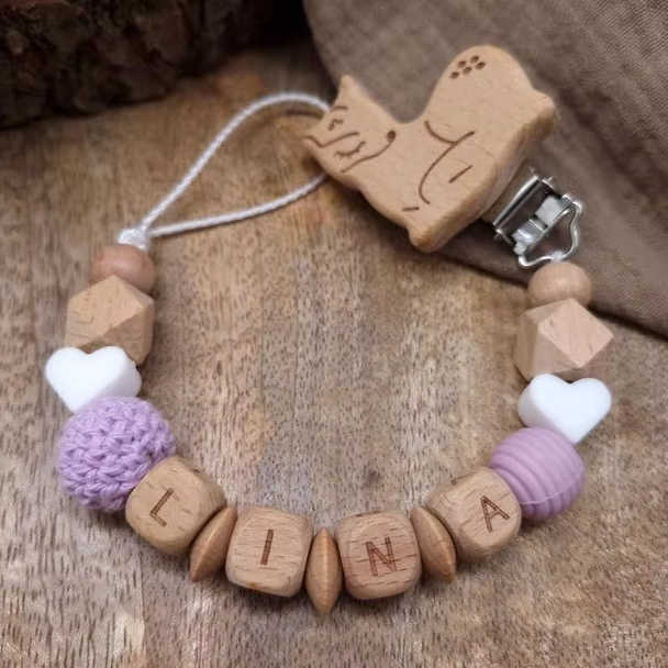Llaveros Personalizados, Palabras Personalizadas, Nombre, Cuentas de Corazones de Silicona, Bola de Ganchillo, Chupete de Madera Original, Regalos de Cumpleaños para Bebé