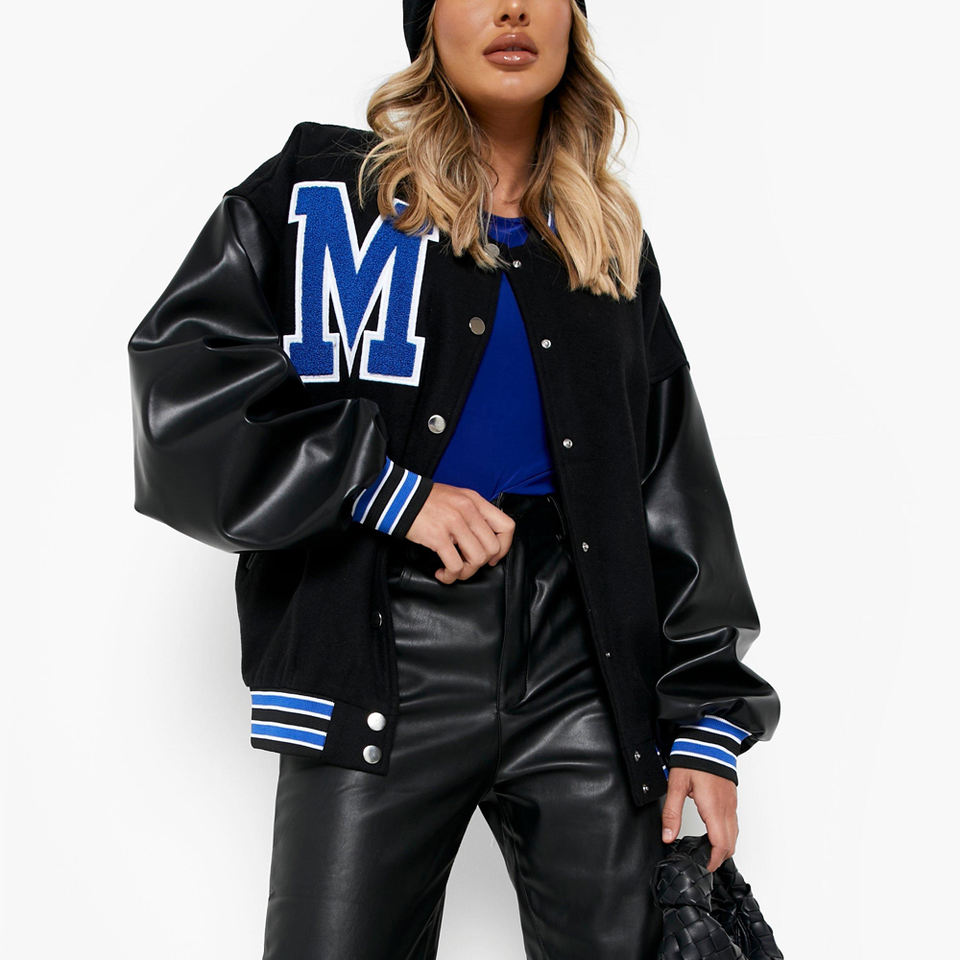 Chaqueta Varsity Corta de Lana con Logotipo Personalizado para Mujer, Mangas de Cuero, Estilo Urbano, Chaquetas Varsity Recortadas