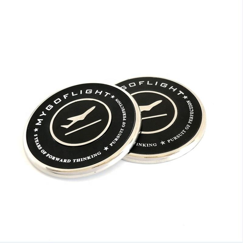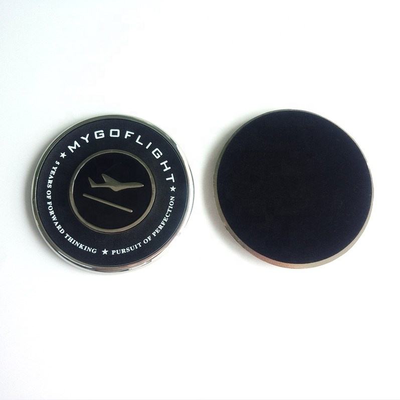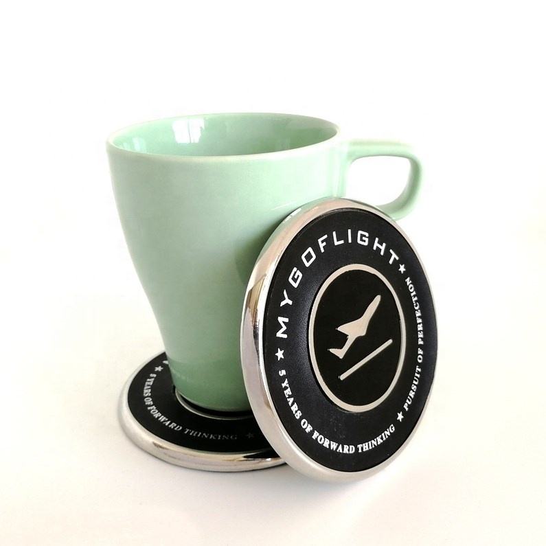 Taza de monedas de metal personalizable, regalo de forma redonda de lujo, posavasos de té con inserto de cuero de PU pegado negro y respaldo de terciopelo antideslizante