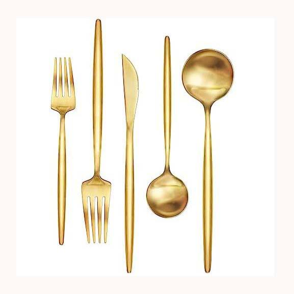 Juego de Cubiertos de acero inoxidable para restaurante de lujo con mango simple plano chapado en oro de metal personalizado