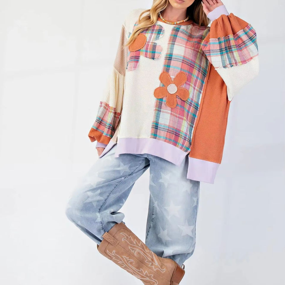 Personalizar tela mixta Top Daisy parches pulóver para mujer invierno