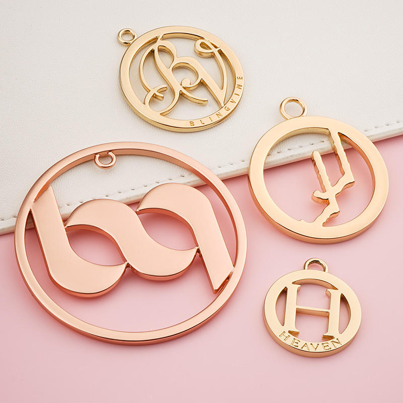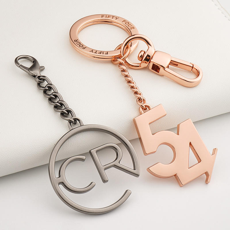 Llavero de metal personalizado en oro rosa con logo circular cepillado en bronce, colgante metálico para bolso con cadena y cierres de langosta para bolsos de mano
