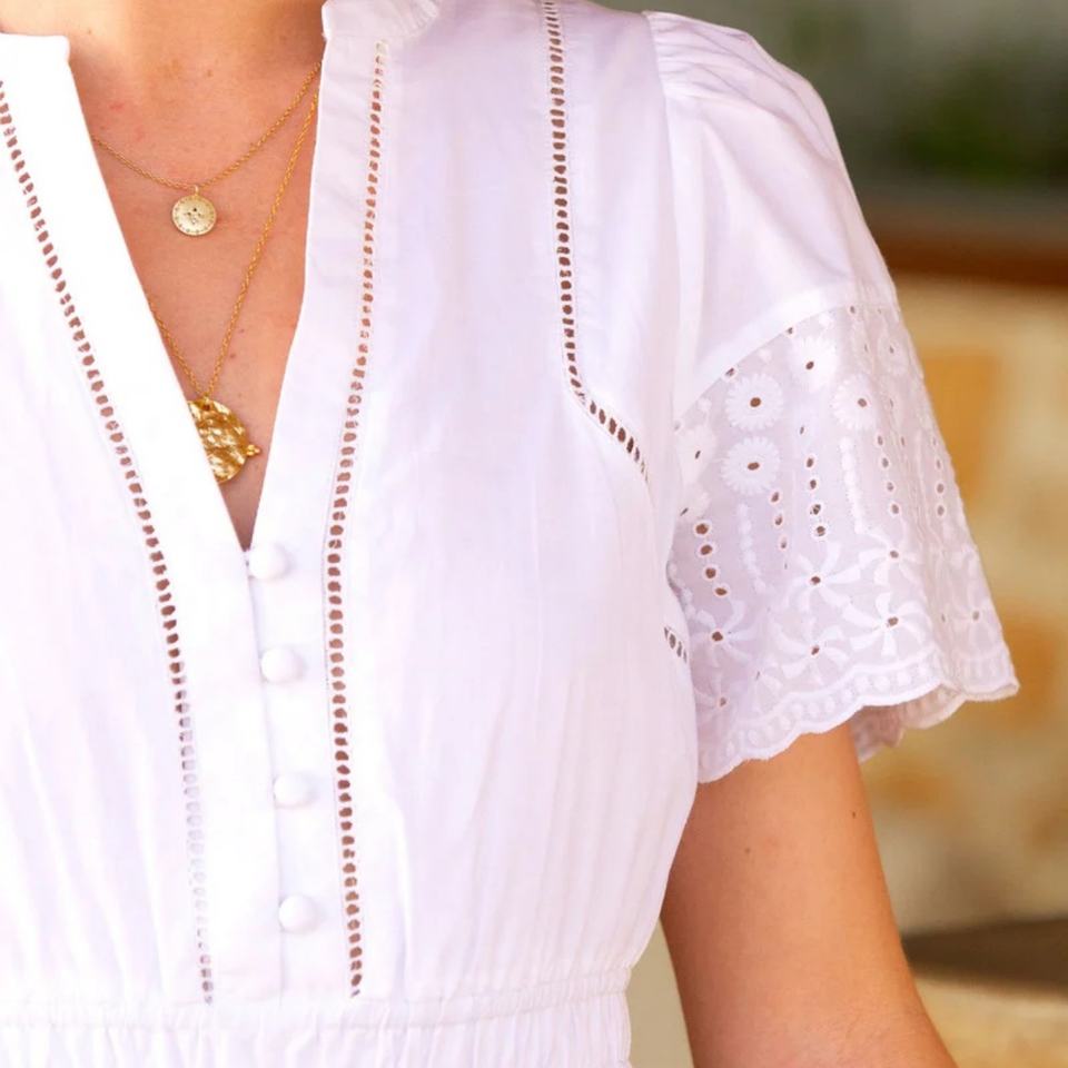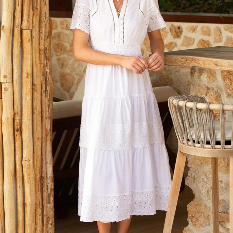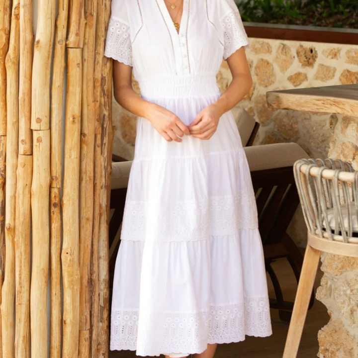 Vestido Midi de Verano para Mujer, Personalizable, con Volantes, Elegante, de Algodón y Lino, Tejido Floral, con Aberturas, Cuello en V, Casual, Corte en A, Manga Corta