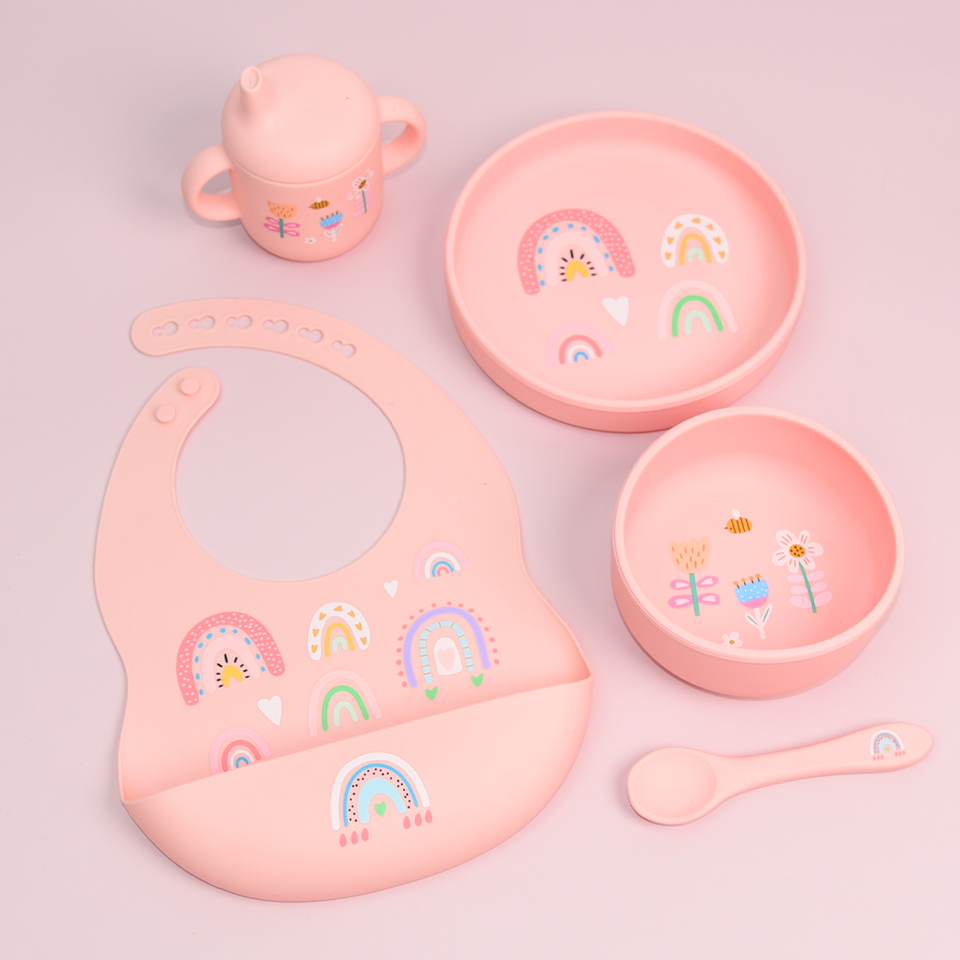 Vajilla Personalizada con Estampado, Set de Alimentación de Silicona para Bebés, Libre de BPA, Set de Cuchara de Silicona, Babero, Pajita y Vaso Antiderrames
