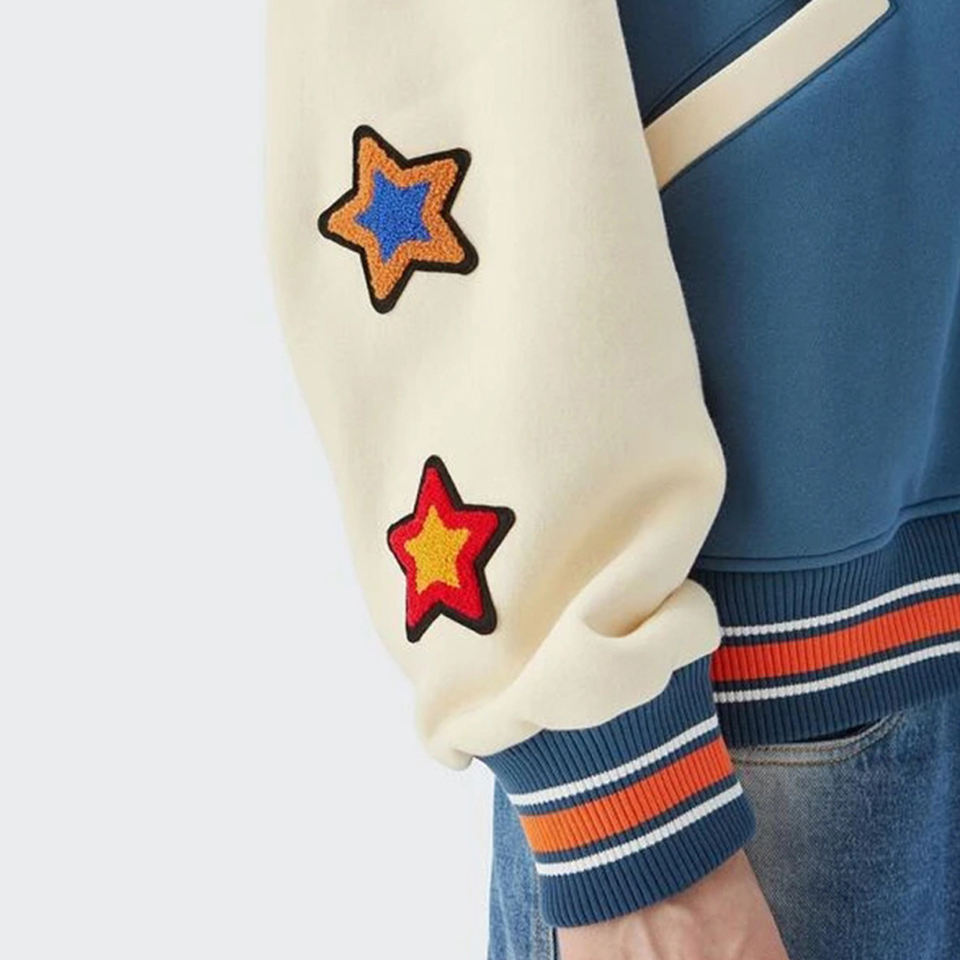 Chaquetas de Material de lana de color azul con chenilla, parches bordados personalizados, 2023