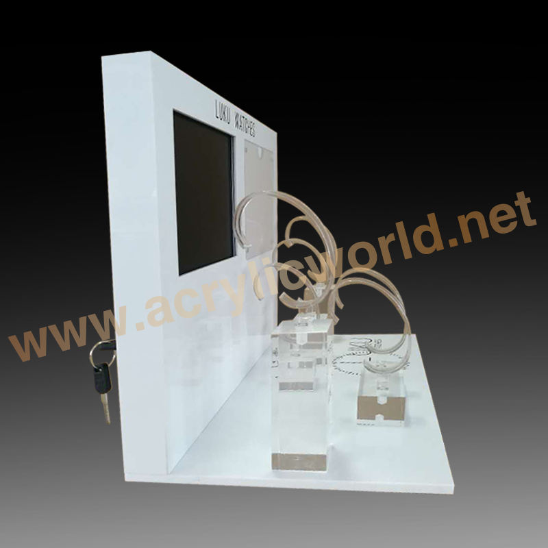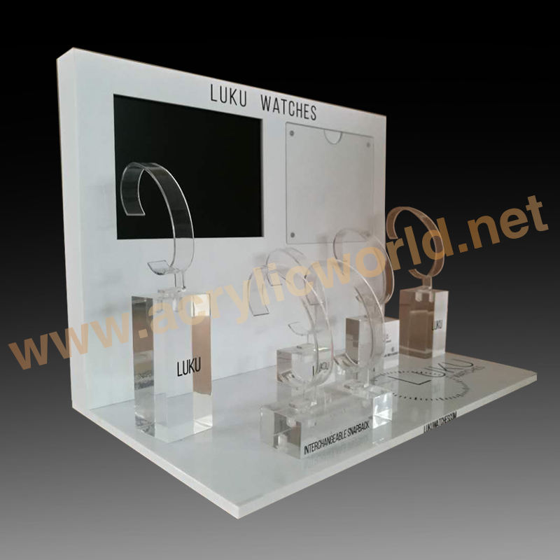 Diseño de soporte de exhibición de reloj de material acrílico personalizado con soporte de exhibición de reloj LCD con anillos C