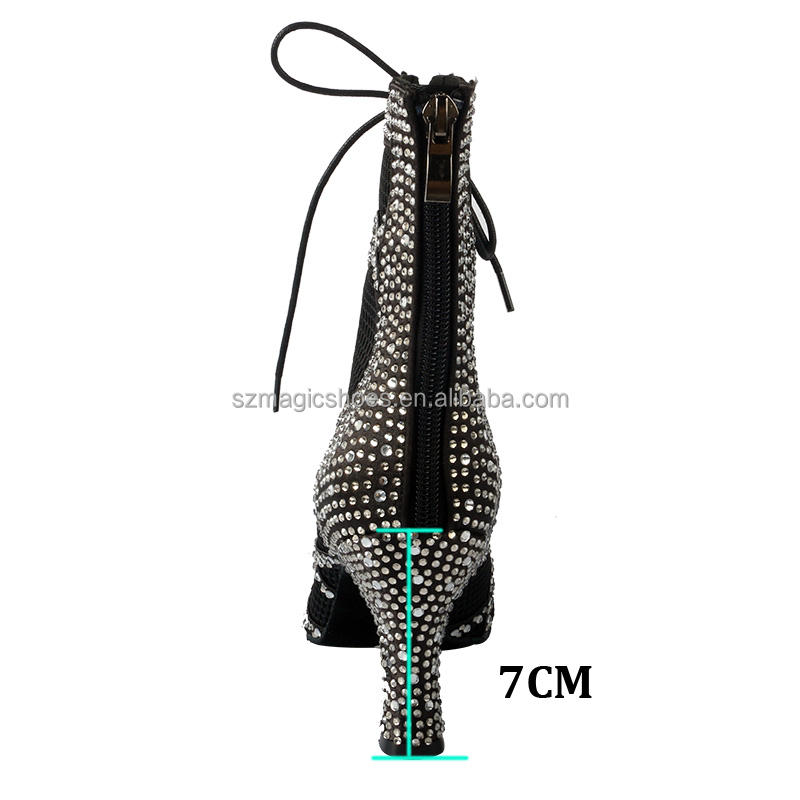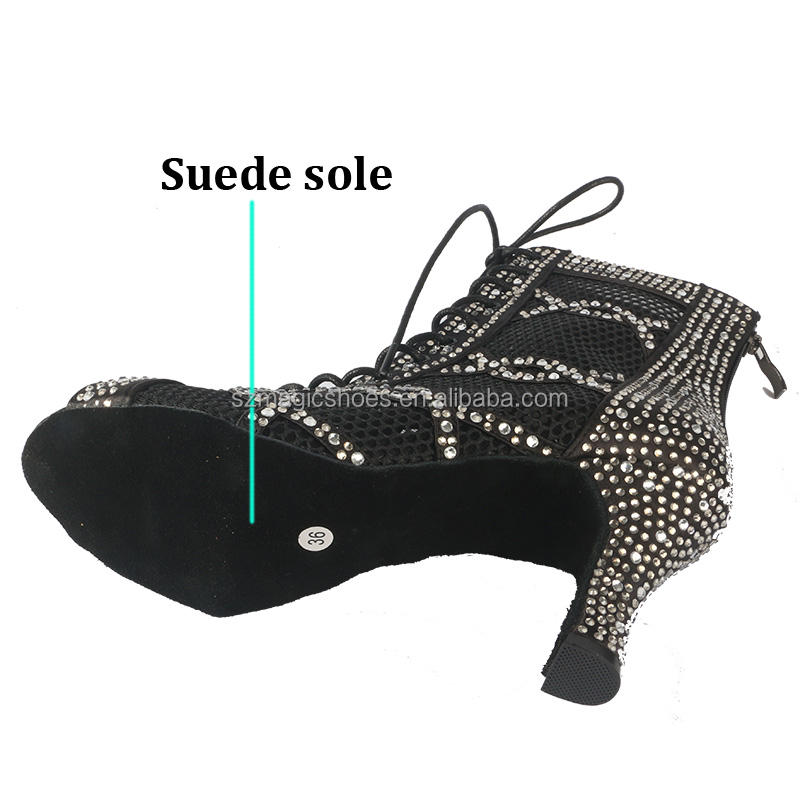 Bota de baile de suela blanda negra personalizada para mujer, tacones de cristal de satén latino con cremallera de 8CM