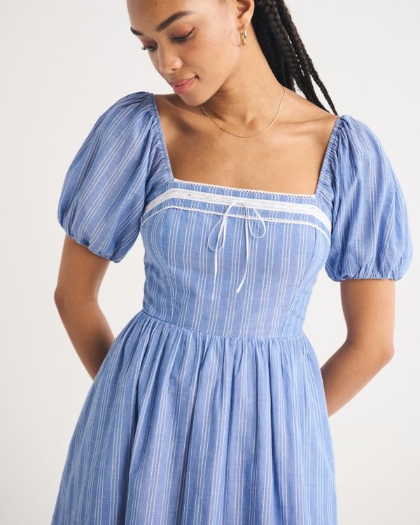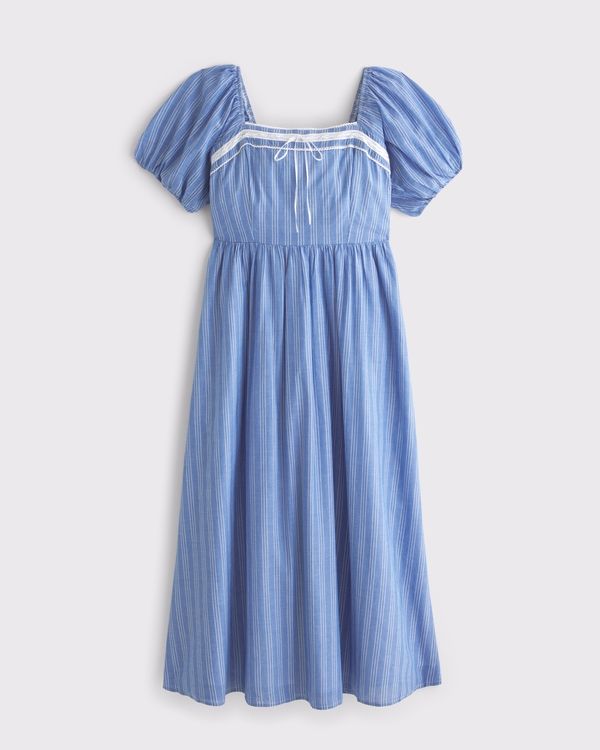 Vestido Leduo Personalizado Azul con Mangas de Gasa, Cuello Cuadrado y Largo por Debajo de la Rodilla con Lazo de Encaje para Mujer